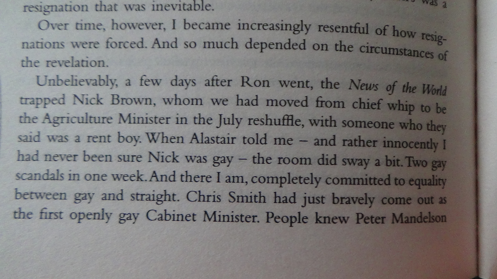 “Alistair [Campbell] heroically pursuaded them to run it with Nick coming out as a gay man. The result was that the story turned from a sordid scandal into an honest confession and Nick was saved.”