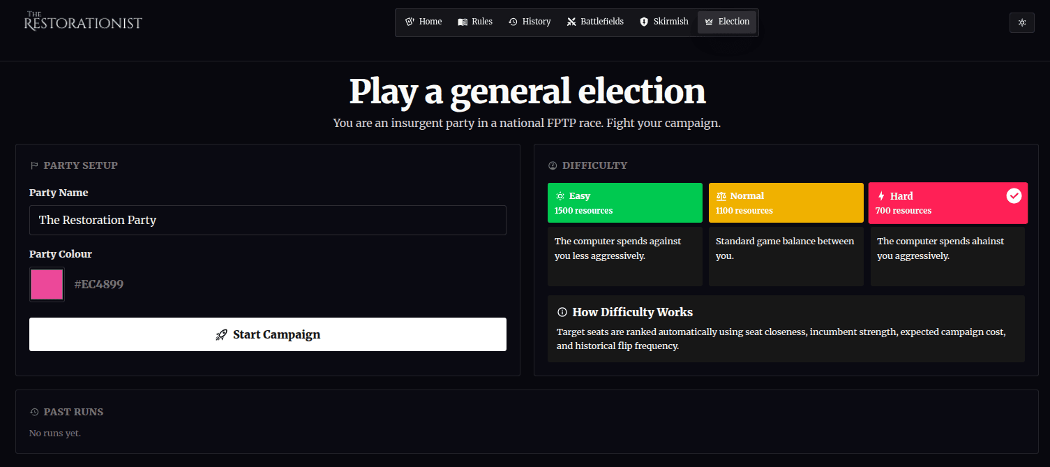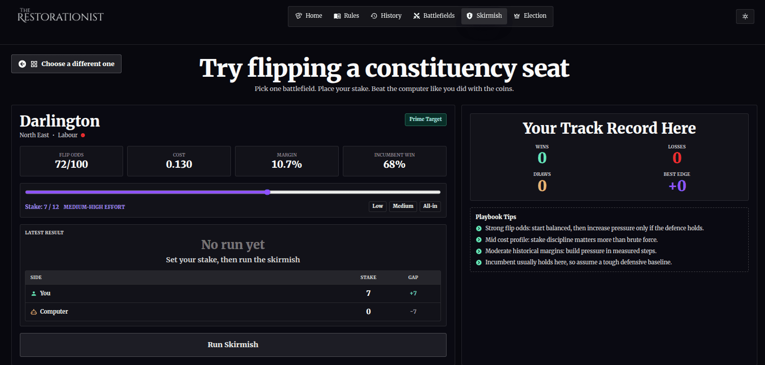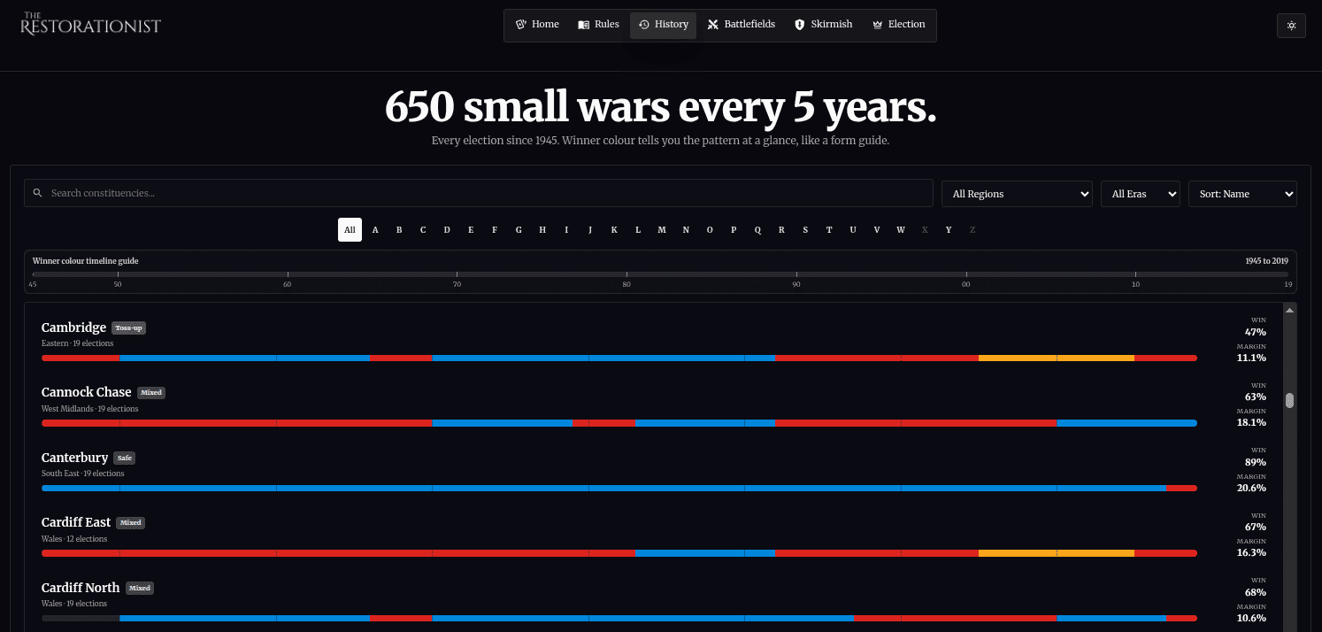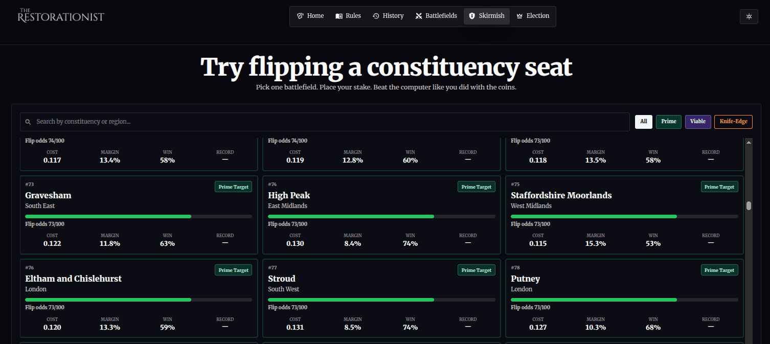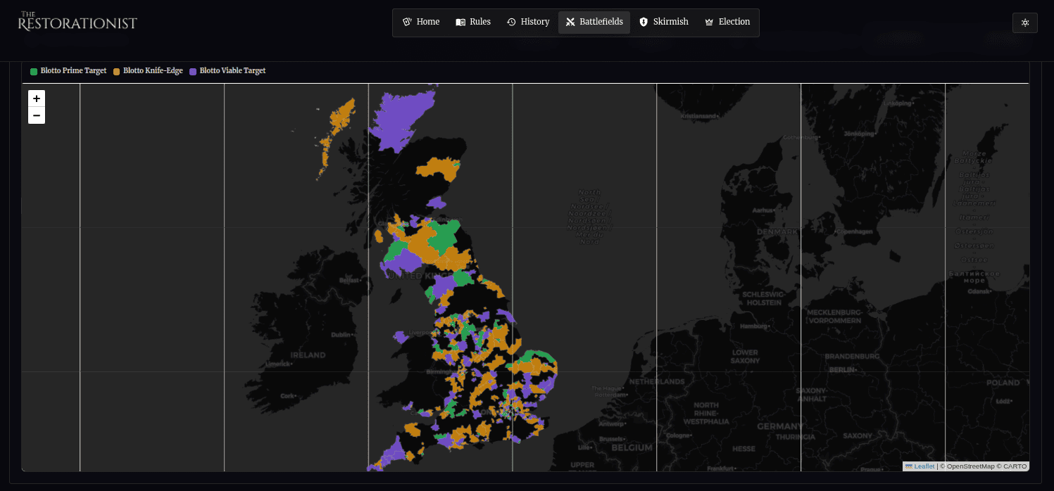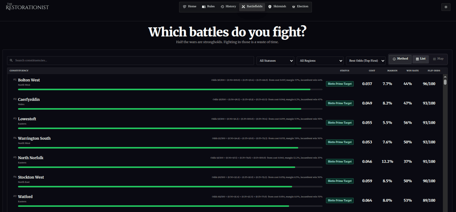 You don't win British general elections by getting the most votes. You win them by optimising your spread and strategically contesting enough open battlefields. 650 available; 326 to win. You can't win them all. The Restorationist's Colonel Blotto dashboard is a way of learning and practicing FPTP.