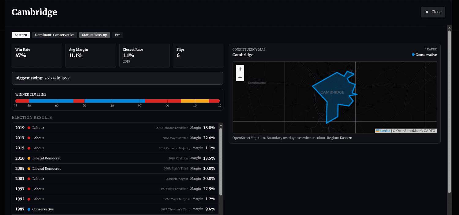 Next, we go to the next level: real results, real constituencies, and a best-effort simulation of how a local election is won. You're playing the computer again, but this time in a real electoral ground.