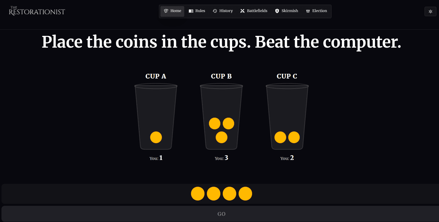 This one is simple and teaches resource allocation. You can try this in the pub to learn the basics. There are two players. You have to win two of the cups against the other guy. The "the other guy" here is the computer (the page).