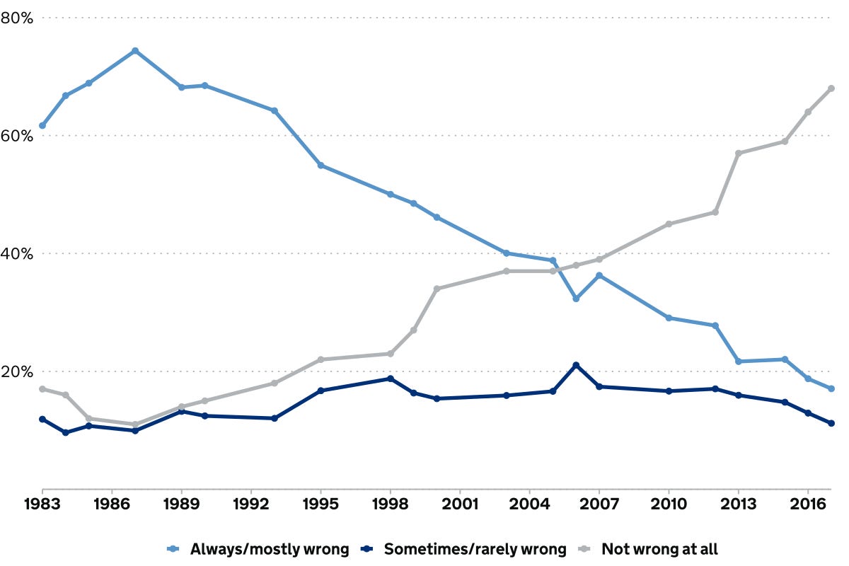 As George Will reminded us in the 1980s, government has an inherent leadership element, and morals can shift in response to such leadership. When policies are implemented that run counter to the common sense of a people, if done carefully, those policies can transform the peoples’ “common sense”. This has been known since the days of Ancient Greece. Again, I personally am not making a judgement over what those policies ought to be; I am merely pointing out a governing reality.