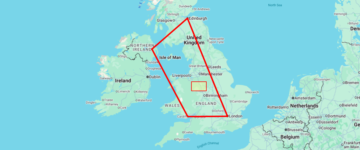 Establishing the symbolic geometric centroid of the UK is not an exact science; in fact, you could call it a fool's game. However, one can make a rough guess by mapping the polygon whose points connect the political centres of London, Edinburgh, Cardiff, and Belfast.