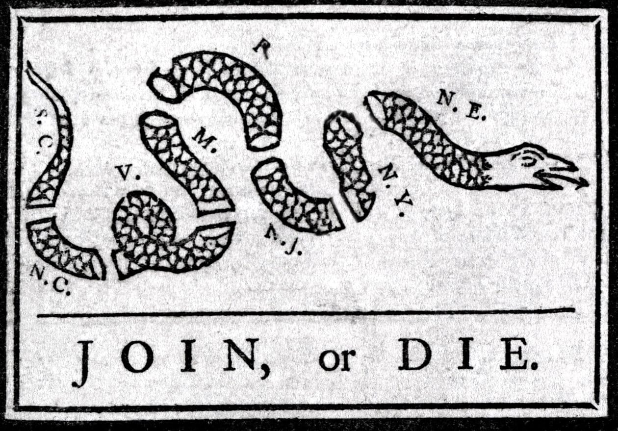 The Articles of Confederation failed precisely because it couldn't solve this coordination problem. Each state could effectively "veto" any decision, just like traitors sabotaging the generals' attack plans. Without the common enemy which had made Franklin's "Join, or Die" so powerful, the colonies faced potential fragmentation - picked off one by one by foreign powers or torn apart by internal strife.