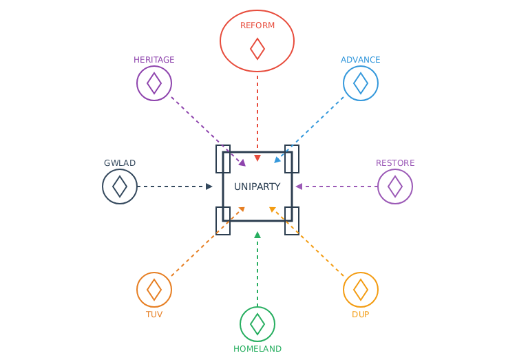 - The various Ulster unionist parties (DUP, UUP, TUV, etc.)