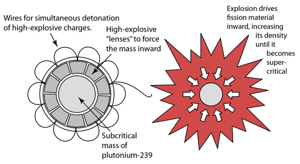 The implosion design works differently: the opposite of explosion. Picture a hollow sphere of plutonium or uranium surrounded by specially shaped conventional explosives. When these explosives detonate simultaneously from all directions, they create an inward-traveling shock wave which compresses the fissile material to a much higher density. This compression achieves criticality not by adding more material, but by reducing the volume - the same mass in a smaller space means neutrons have less distance to travel before hitting another nucleus, making the chain reaction more likely.